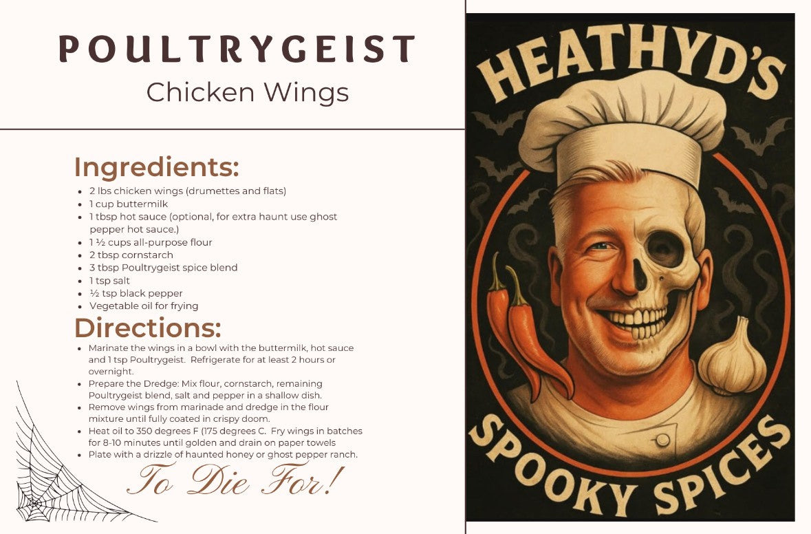 POULTRYGEIST casts a bold spell of sage, oregano, and black pepper, igniting with ghostly aromatics and the haunting heat of guajillo chiles, before vanishing into the bittersweet whisper of orange peel.